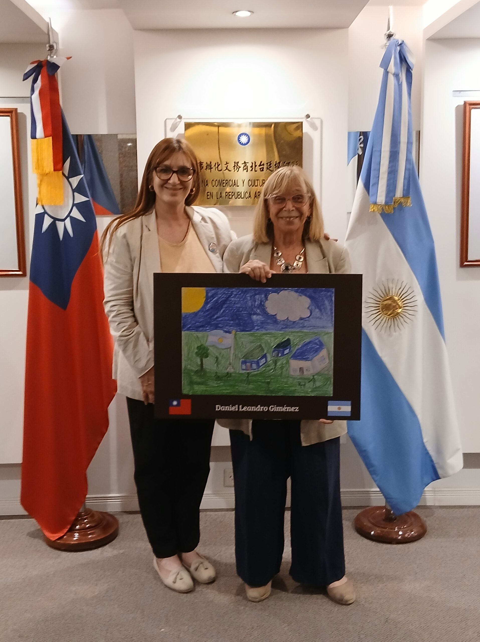La Cont. Beatriz Resnik, Coordinadora de Relaciones Institucionales de Fundación Garrahan, recibió durante la ceremonia, realizada en la Oficina Comercial y Cultural de Taipéi en Argentina, el diploma para el premiado Daniel Leandro Giménez (dibujo “Mi lugar favorito” – Salta).